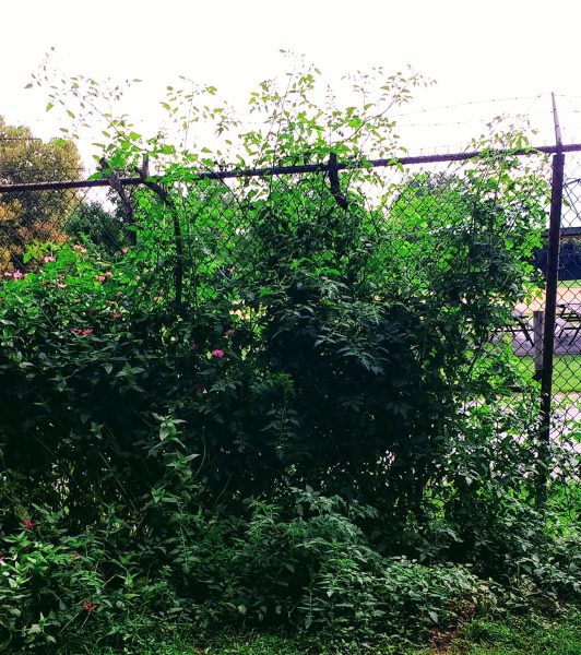 I always plant “sacrificial” tomatoes in our backyard for deer. This year, I decided to plant them in the rental house backyard (which is next door to ours). Deer and other critters have nibbled on the plants off and on, but the plants have grown and grown and grown. In fact, they’re taller than the lovely barbed wire fence that separates the yard from the park.